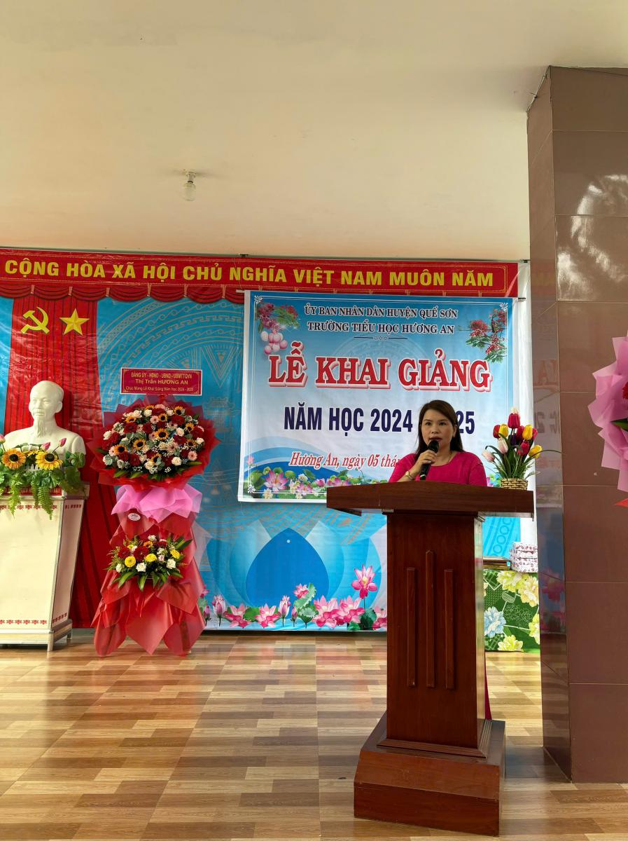 Cô Đồng Thị Huệ- Bí thư Chi bộ-Hiệu trưởng nhà trường đọc diễn văn khai giảng