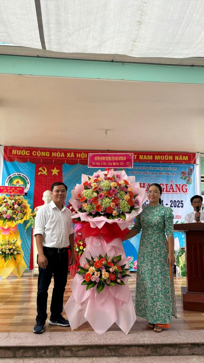 Cô Đồng Thị Huệ - Bí thư chi bộ Hiẹu trưởng Nhà trường nhận hoa từ Đảng ủy- HĐND- UBND Thị trấn Hương An