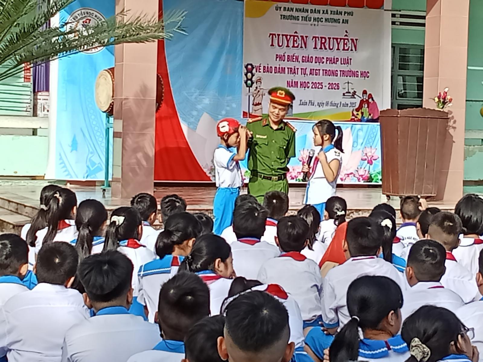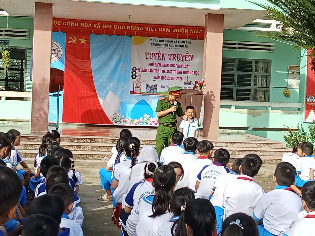 Sáng ngày 08/9/2025, Liên đội trường Tiểu học Hương An phối hợp với Công an xã Xuân Phú đã tổ chức buổi ngoại khóa với nội dung tuyên truyền Luật giao thông đường bộ cho các em học sinh trường Tiểu học Hương An.
